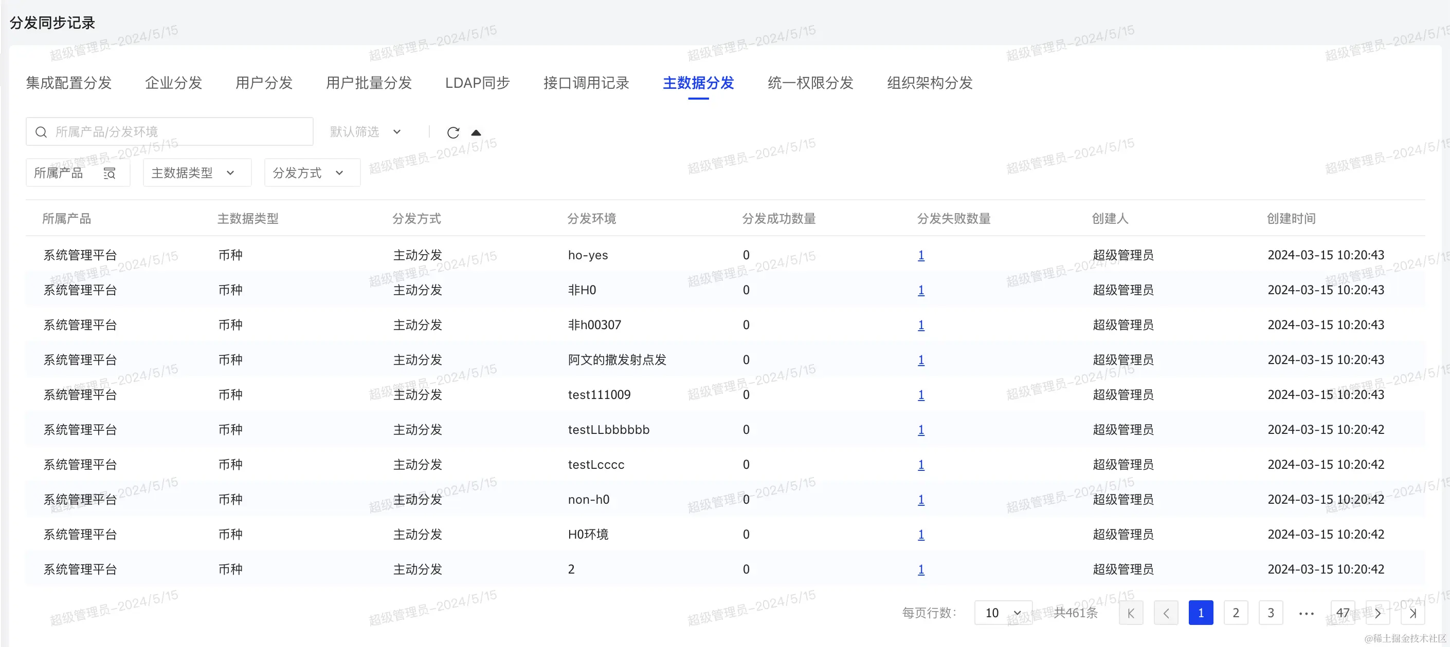 在这个页面也可以同步分发该类型主数据的全部数据。只需一点击,数据全量分发各个环境,每条数据都会有清晰的同步日志,可以通过分发同步记录功能进行查看: