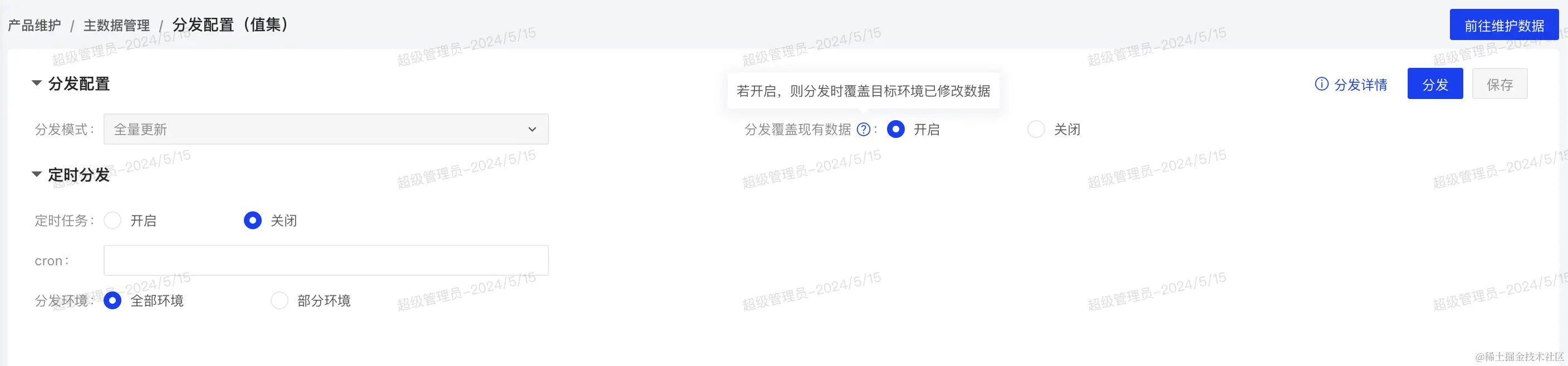 在维护完值集之后可以对当前数据选择环境进行分发,也可以一次性选择多个环境进行分发。