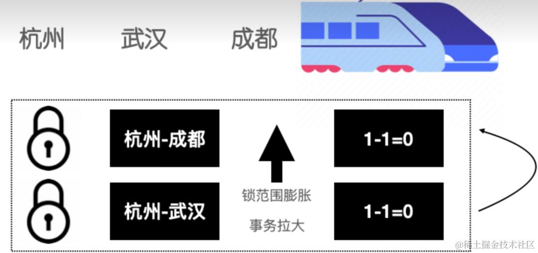 - 读扩散:扣减只需要关注列车站点之间的扣减,关注车次,查询的时候再去动态计算。
