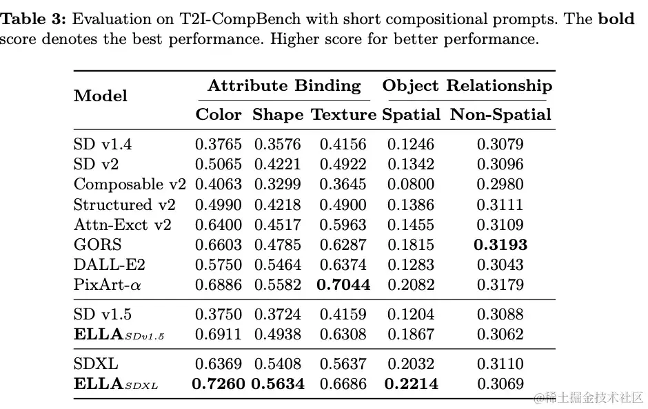 - ELLA在T2I-CompBench上的表现也优于其他 SOTA 模型,例如DALL-E 3和SDXL,特别是在包含多种属性和关系的多物体组合场景中。