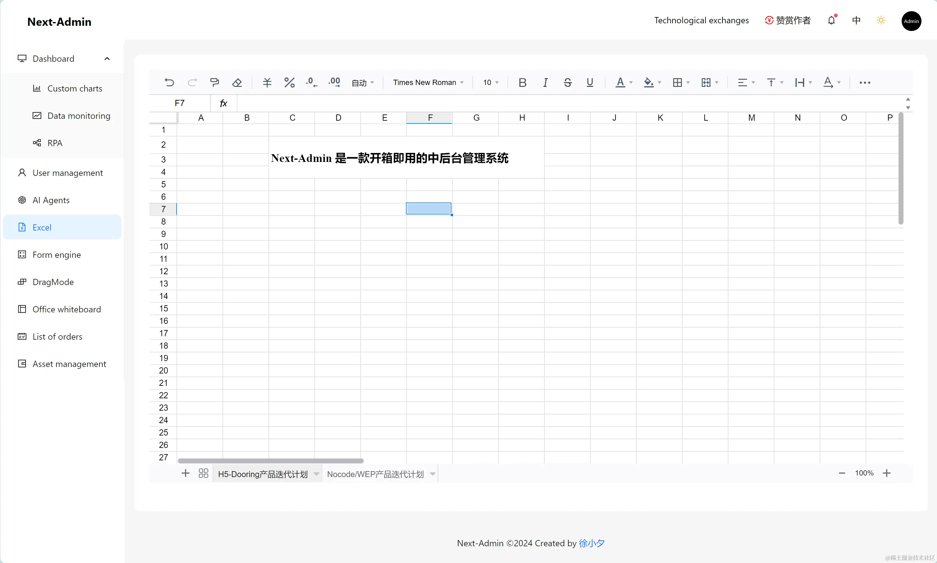 同时我也把其中一款电子表格集成到了Next-Admin (基于nextjs的开源中后台系统)中,方便大家学习参考。