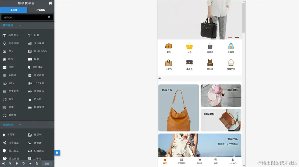 step3, 在线编辑修改站点内容,设计完成后,点击发布这样一个奢侈品女包小程序就制作完成了
