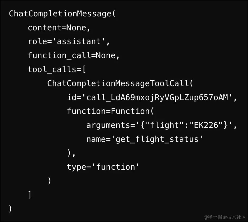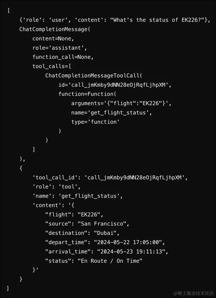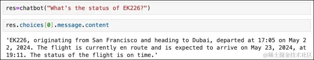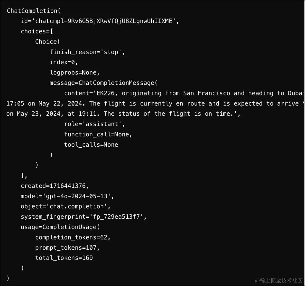 如果适用,API 使用指定的工具来处理这些消息。例如,当我们发送提示“EK524 的状态是什么?”时,GPT-4o 确定需要调用工具列表中提供的函数,并返回以下响应: