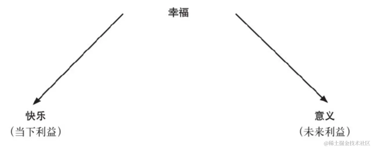 我们可以把这个解释与“感悟幸福型”相连:快乐代表现在的美好时光,属于当下的利益;意义则来自于目标,一种未来的利益。