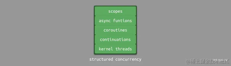 大多数情况下,结构化并发的实现技术栈如下图所示。从上层到底层可以分为五个部分,分别是: