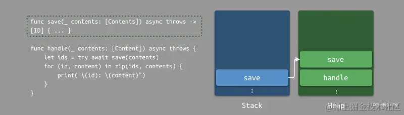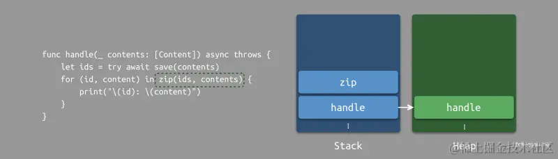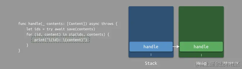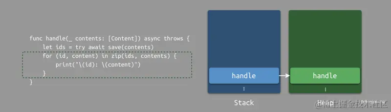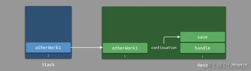 假设一个线程调用了一个 handle 方法。在这个阶段,最近的堆栈将是 handle。当 handle 遇到内部的 await 关键词修饰的异步操作时,运行时会将 handle 方法的计算续体存储至堆中,从而等待异步操作完成。