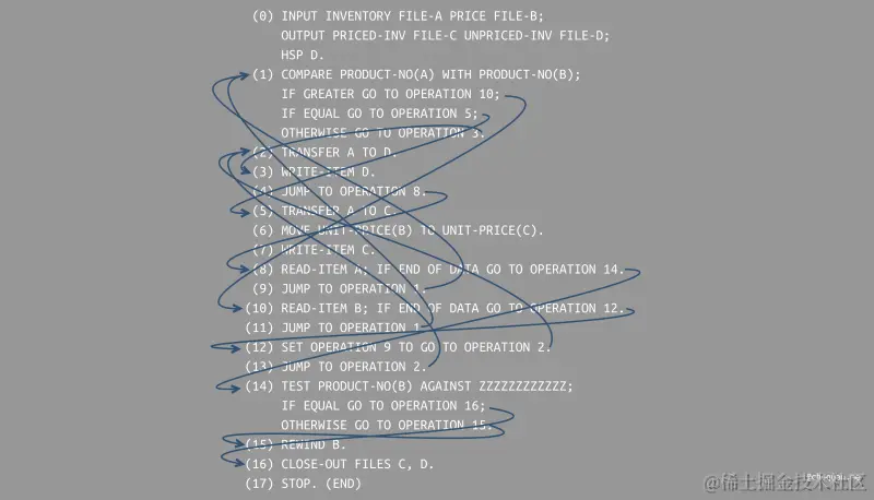 如下所示,我们对 FLOW-MATIC 代码的控制流使用箭头进行变标记,可以发现整个逻辑变成了一团糟,如同面条一般。