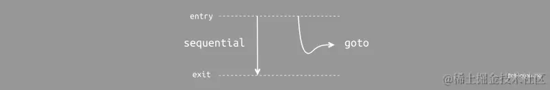顺序执行的逻辑非常简单,它总是能够找到执行入口与出口。与之相反,跳转执行则充满了不确定性。如果程序中存在 GOTO 语句,那么它可以在 任何时候跳转至任何指令位置。一旦程序大量使用了 GOTO 语句,那么最终将变成 面条式代码(Spaghetti code)。