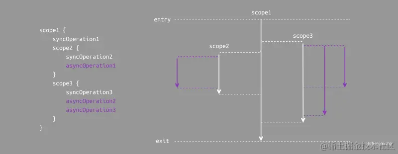 如果编程语言只提供了异步函数,而不支持作用域,事实上也能够避免内部异步任务生命周期超出外部调用方法声明周期,因为异步函数的调用是通过以阻塞式的方式执行的。