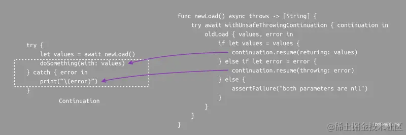 下图所示,当我们使用新版 newLoad 方法时,等待异步执行的代码被封装成了一个函数,函数的参数是一个 Continuation。我们可以根据不同的情况向 Continuation 传递值或错误,从而让等待异步执行的代码继续执行。