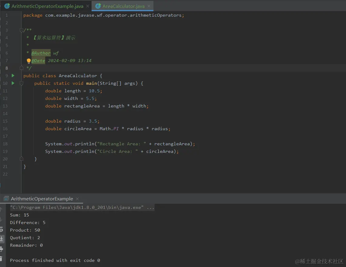 如上程序是一个Java类,名为AreaCalculator。它的main方法是应用程序的入口点。首先,声明了两个double类型的变量length和width,分别表示矩形的长度和宽度。然后,计算矩形的面积,将结果存储在名为rectangleArea的变量中,通过将长度乘以宽度来计算面积。接下来,声明了一个双精度的变量radius,表示圆的半径。然后,计算圆的面积,将结果存储在名为circleArea的变量中。这里使用了Math.PI常量来表示圆周率,并将半径的平方乘以圆周率来计算面积。最后,使用System.out.println方法将矩形的面积和圆的面积打印到控制台上。其中,"+"用于连接字符串和变量的值。打印出来的结果格式为"Rectangle Area: "和圆的面积。总之,我写出来是为了计算了一个矩形和一个圆的面积,并将结果打印到控制台上,方便大家能够学习加以掌握。