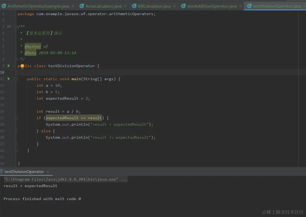 如上代码主要用来测试除法运算符的功能。首先定义了三个变量a、b和expectedResult,分别赋值为10、5和2。然后使用除法运算符将a除以b,将结果赋值给result变量。接着使用if-else语句判断result是否等于expectedResult,如果相等则打印"result = expectedResult",否则打印"result != expectedResult"。