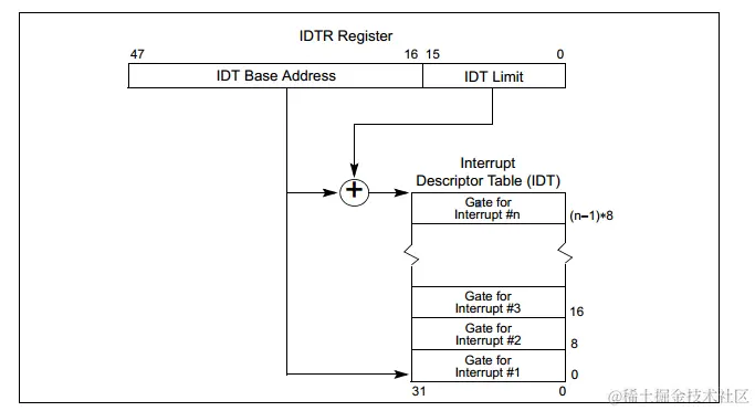 Intel 处理器使用中断描述符表 (IDT) 来处理中断。IDT 由 256 个条目组成,每个条目对应一个向量,并且每个条目占 8 个字节。所有条目都是指向中断处理函数的指针。IDT的地址存储在 IDTR(IDT 寄存器)中。它们之间的关系可以如下图所示: