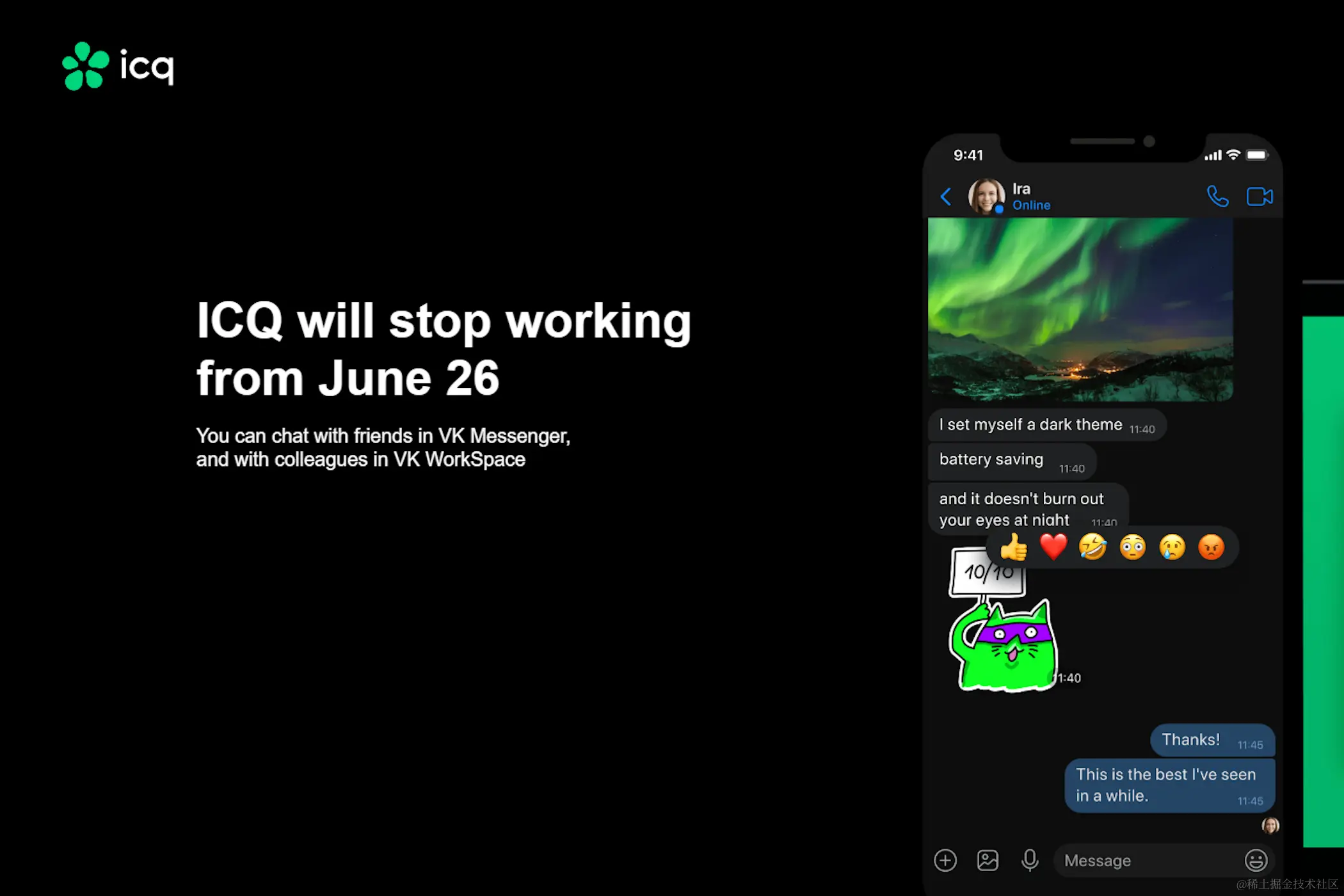 这一消息在ICQ网站上爆出,该网站并没有大张旗鼓地谈论它的关闭。该网站宣布 6 月 26 日为 ICQ 的最后一天,并向所有人保证,您可以继续使用 VK Messenger 和 VK Workplace 与人们交谈。这就是网站的全部内容;没有大篇幅的博客文章,没有泪流满面的送行,什么都没有。