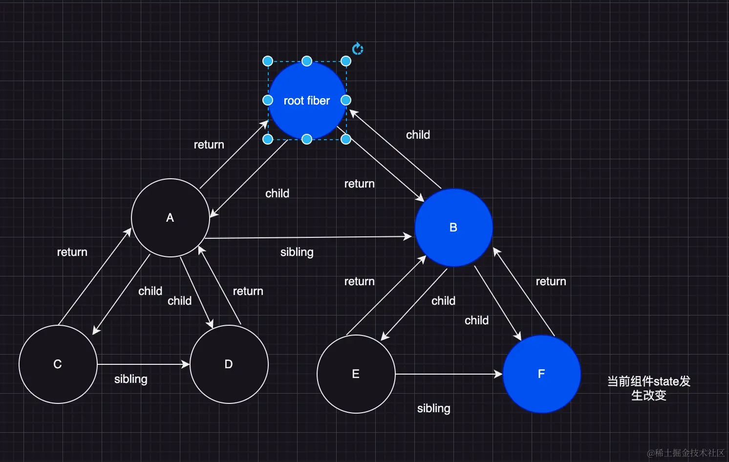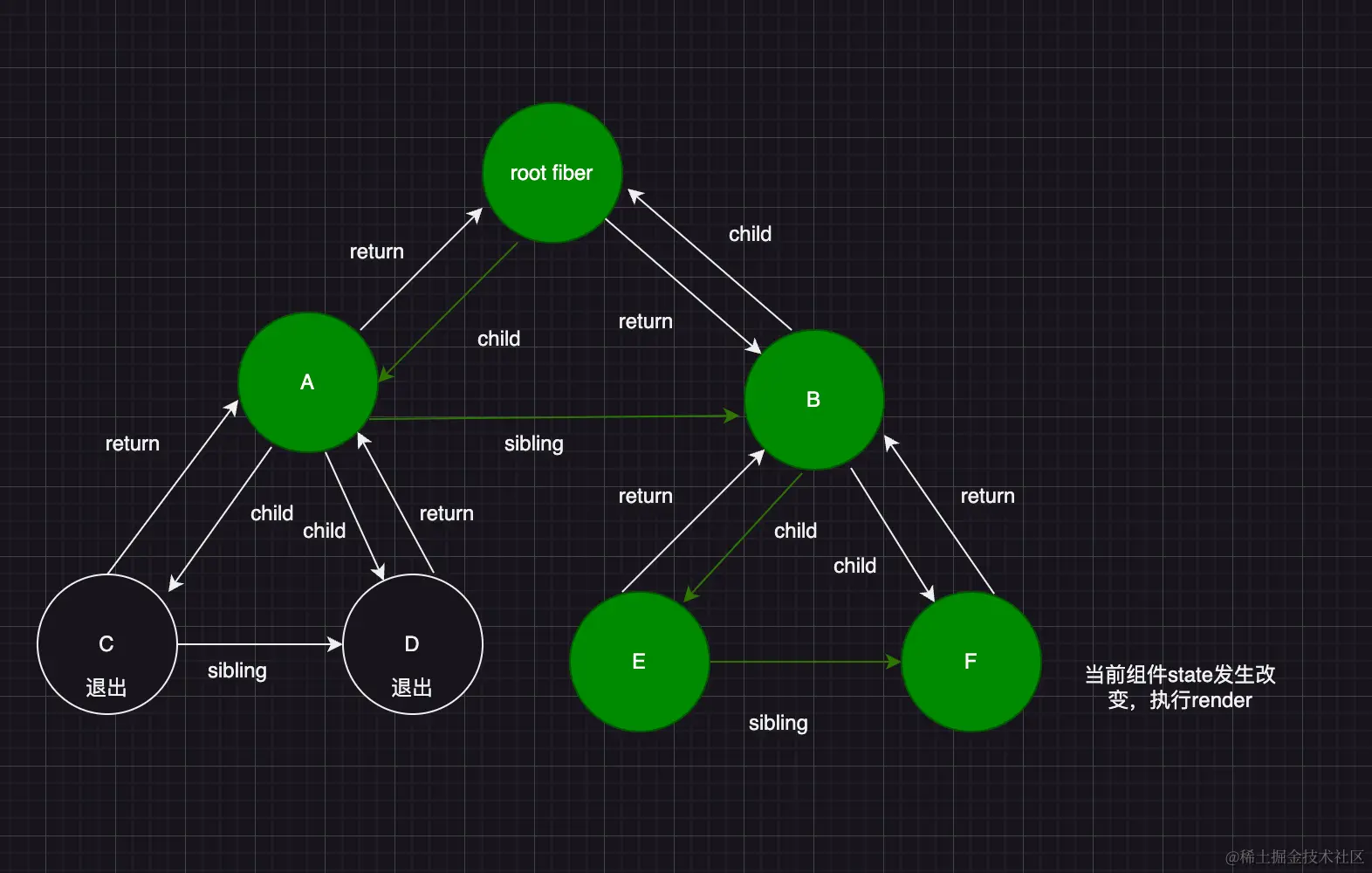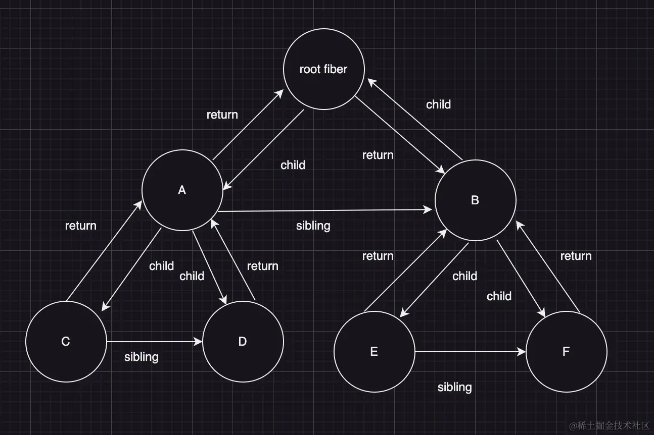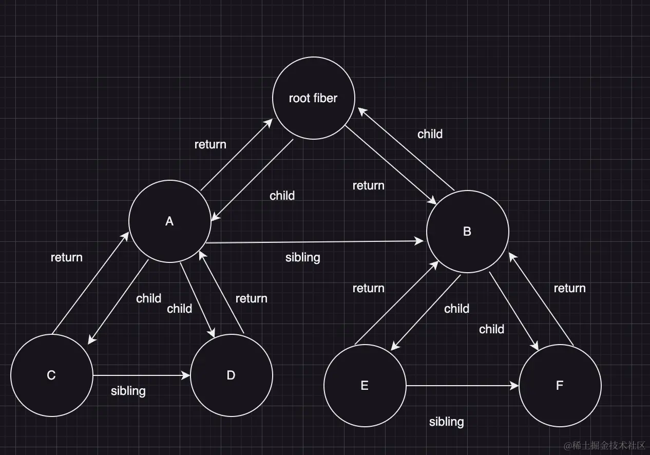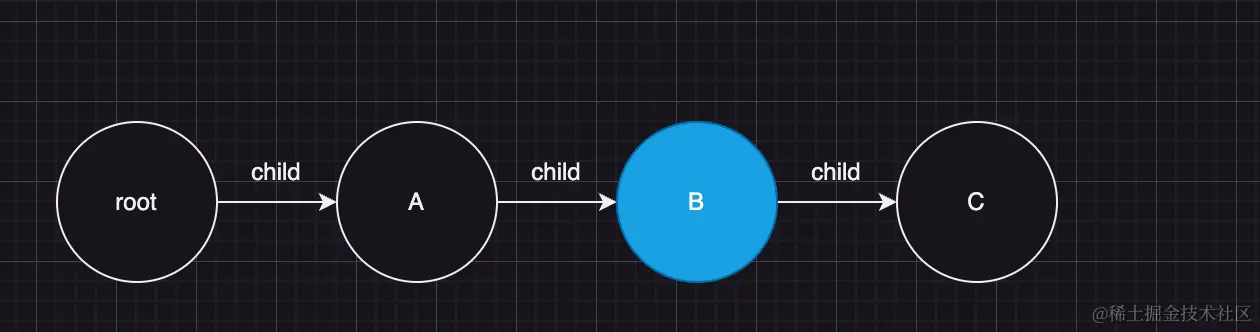 假设有一个组件 fiber 链:root -->child--> A组件 -->child--> B组件 --child--> C组件,如图所示