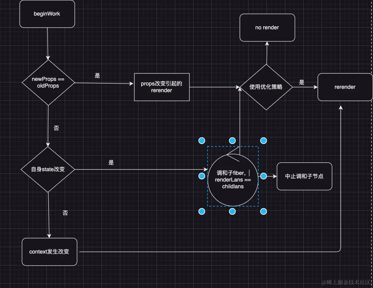 - 既然要从root开始调和,又不想调和整颗树,那么如何找到发生更新的组件呢?其实和我们想的是一样的,react采用childLanes作为标记,如果组件发生了更新,通过return向上递归标记改变父fiber的 childLanes,接下来从 Root Fiber 向下调和的时候,发现 childLanes 等于当前更新优先级,那么说明它的 child 链上有新的更新任务,会向下调和直到找到最后一个fiber的优先级等于当前更新优先级的fiebr