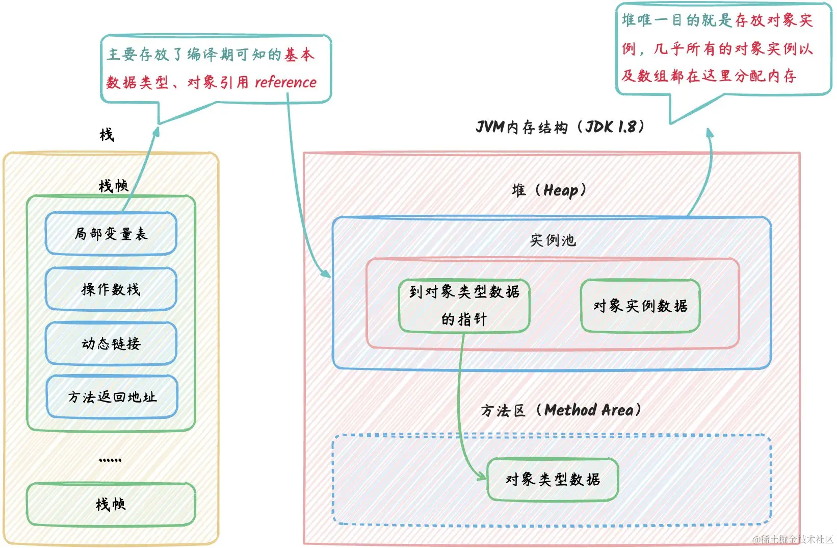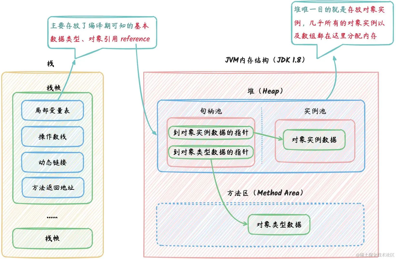 如下图, Java 堆中将可能会划分出一块内存来作为句柄池,reference 中存储的就是对象的句柄地址,而句柄中包含了对象实例数据与类型数据各自具体的地址信息。