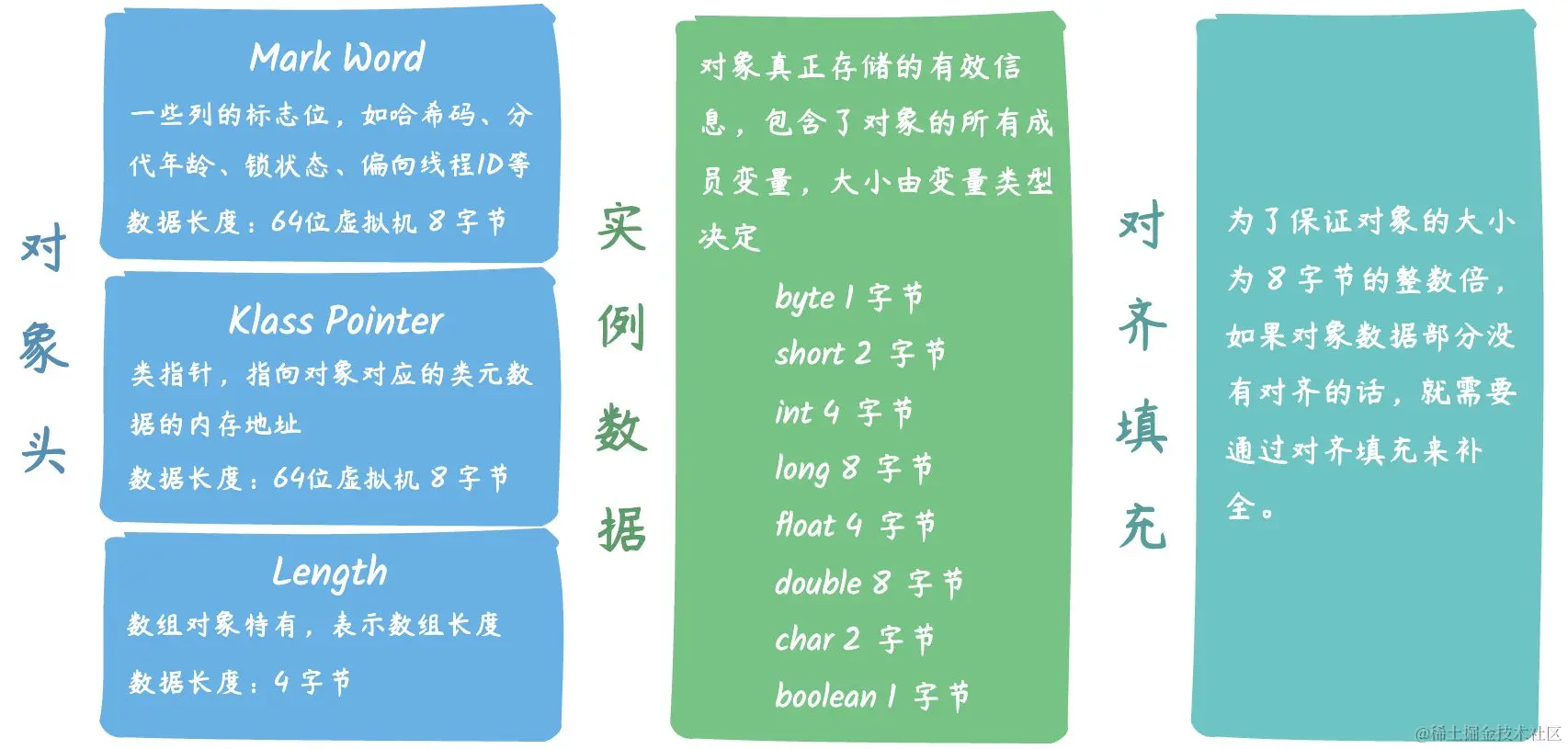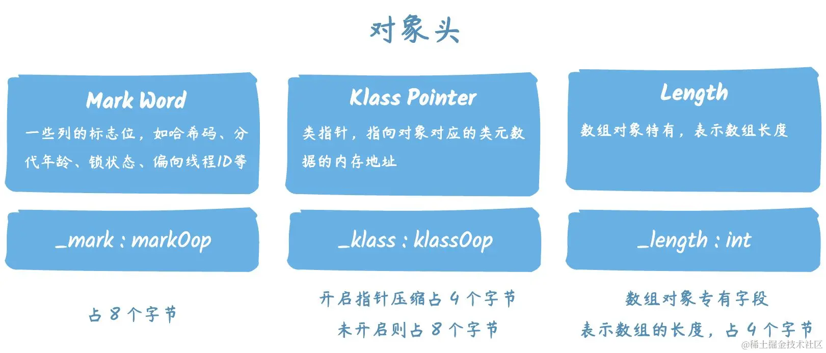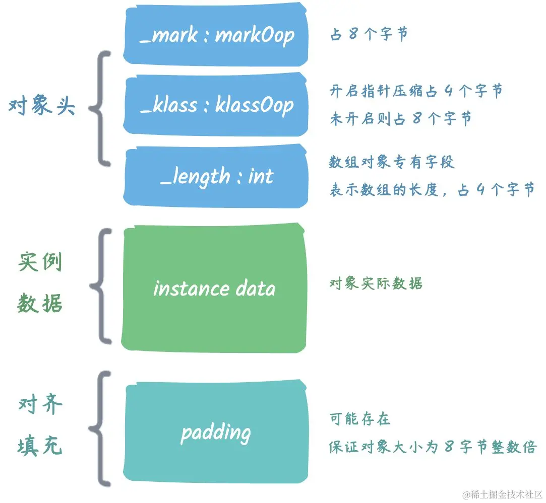 数组对象特有,表示数组长度,占用 4 字节(32bit)空间,因为虚拟机可以通过普通对象的元数据信息确定对象的大小,但是如果数组的长度是不确定的,将无法通过元数据中的信息推断出数组的大小。
