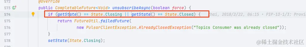 比如这里的一个 consumer 取消订阅两次时候就会抛出异常,此时我们就可以根据异常的地方找到源码里对连接状态的判断条件。