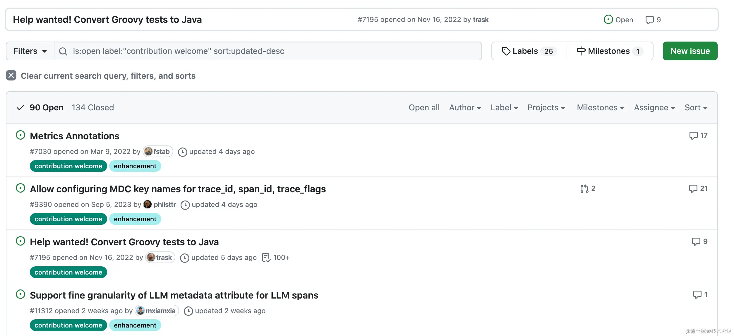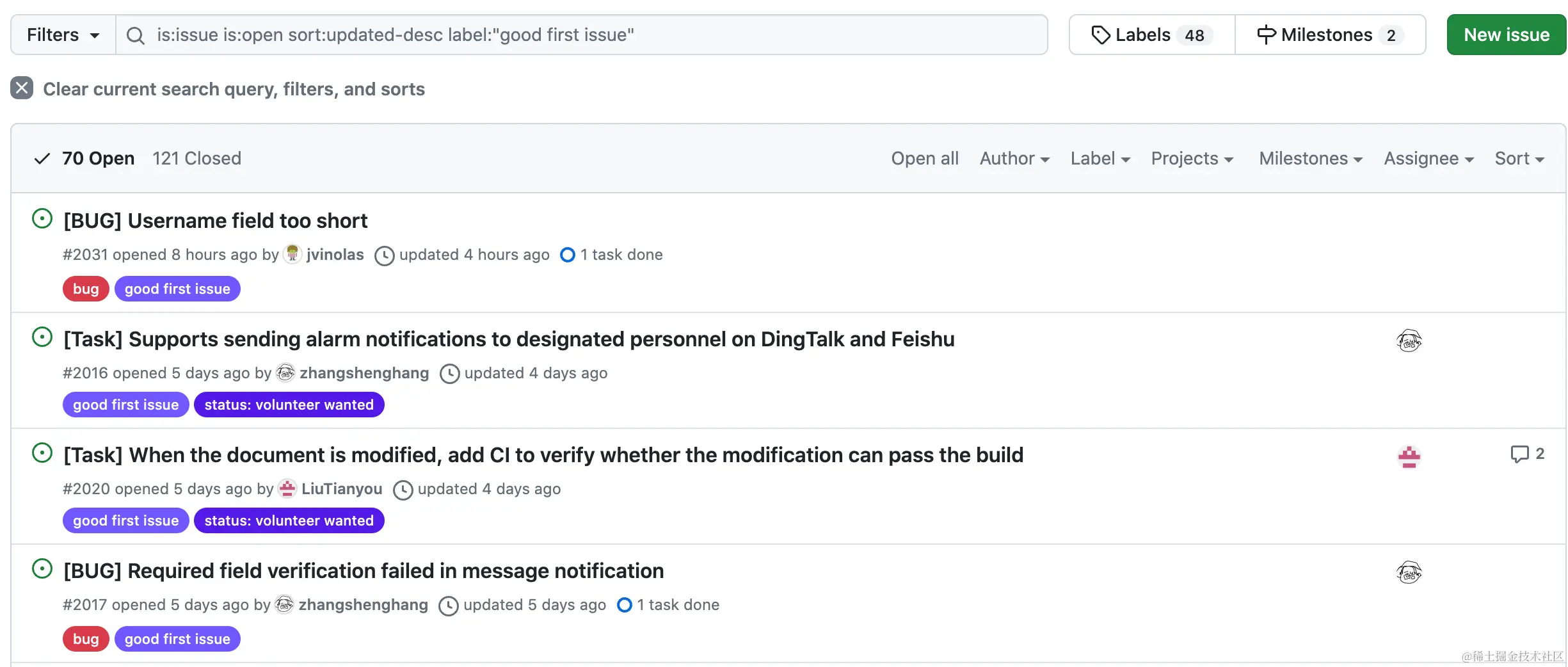 help want/contribution welcome的 issue 或者是 PR。 - 查看这些 issue/ PR 最近的活跃时间,贡献者是否为新人。