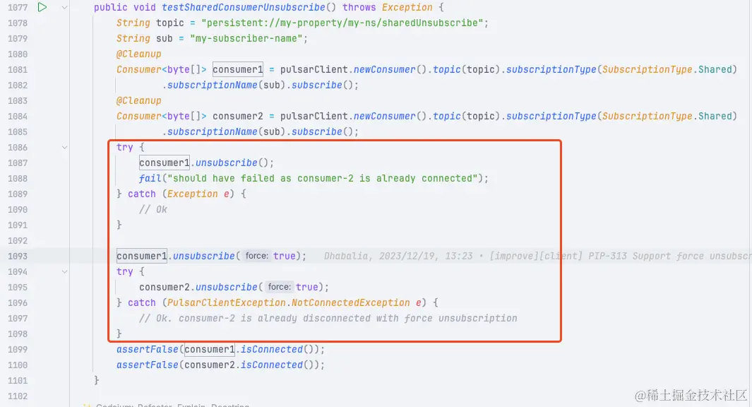 以 Apache Pulsar为例,那就先跑一个消息的生产者和消费者 demo;跑通了之后再尝试看看它客户端已有的单测代码,然后尝试改一些断言,此时就会发现预期值为什么会这么定义。