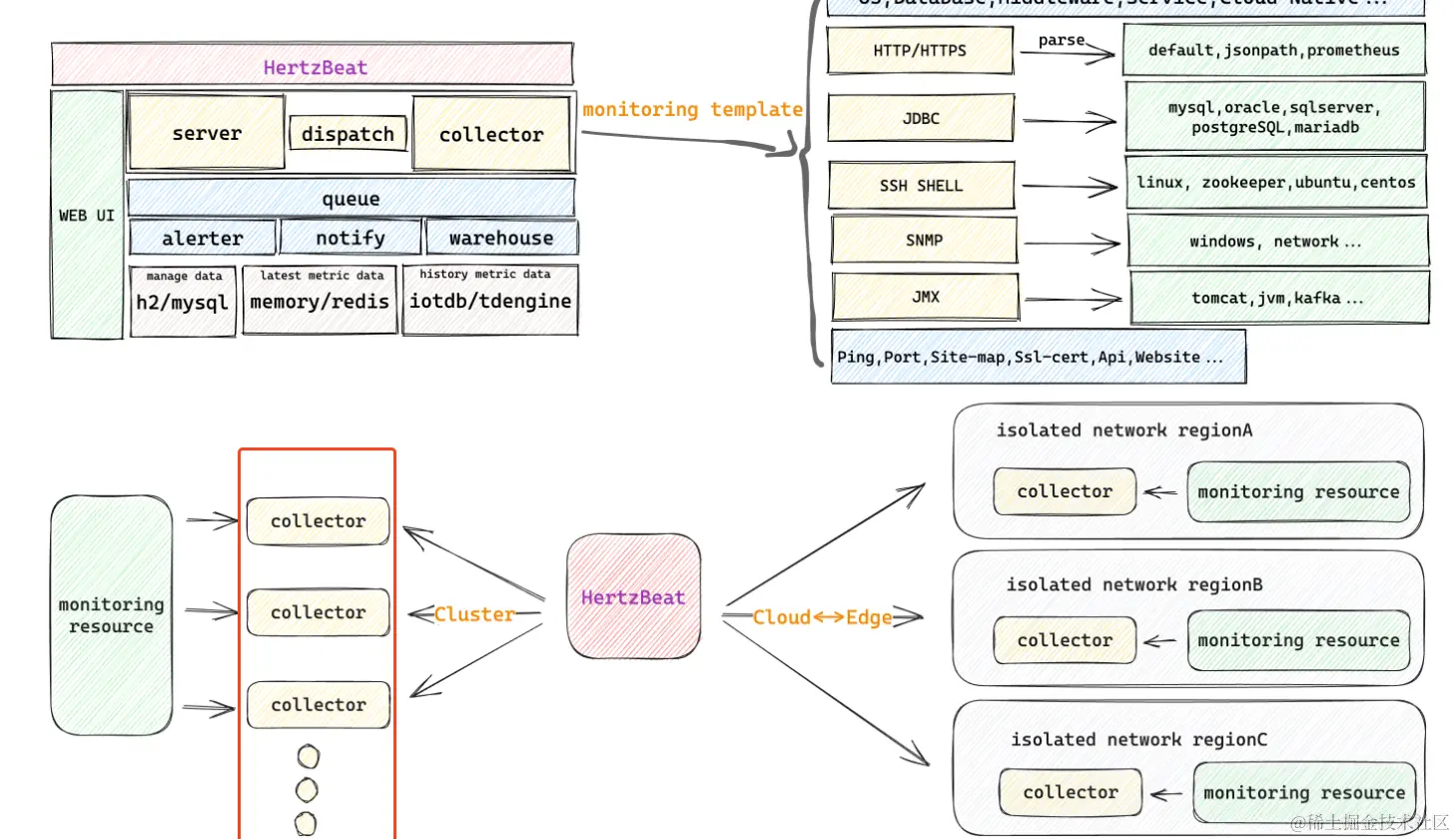 通过官方的架构图可以得知 HertzBeat 是通过一个 collector 去直连目标采集数据的。