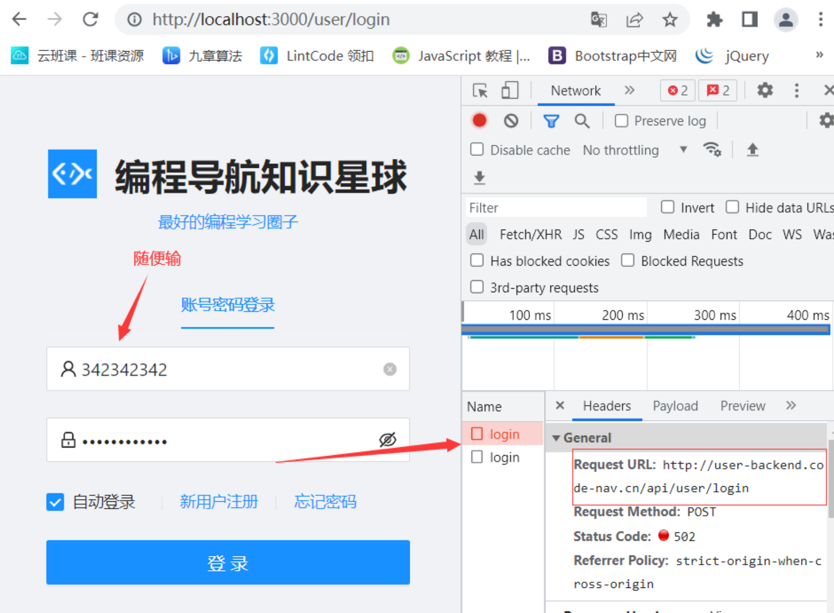 重启后,前端页面会弹出未登录,输入账户密码,点击登录,后端报错了。