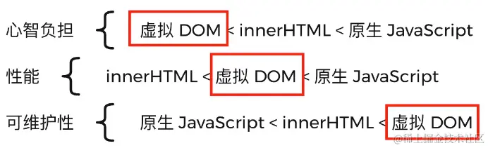 但是它的 心智负担(书写难度)最小, 从而带来了 可维护性最高。所以哪怕它的性能并不是最高的。Vue 依然选择了 虚拟 DOM 来进行了渲染层的构建。这个也是一种性能与可维护性的权衡。