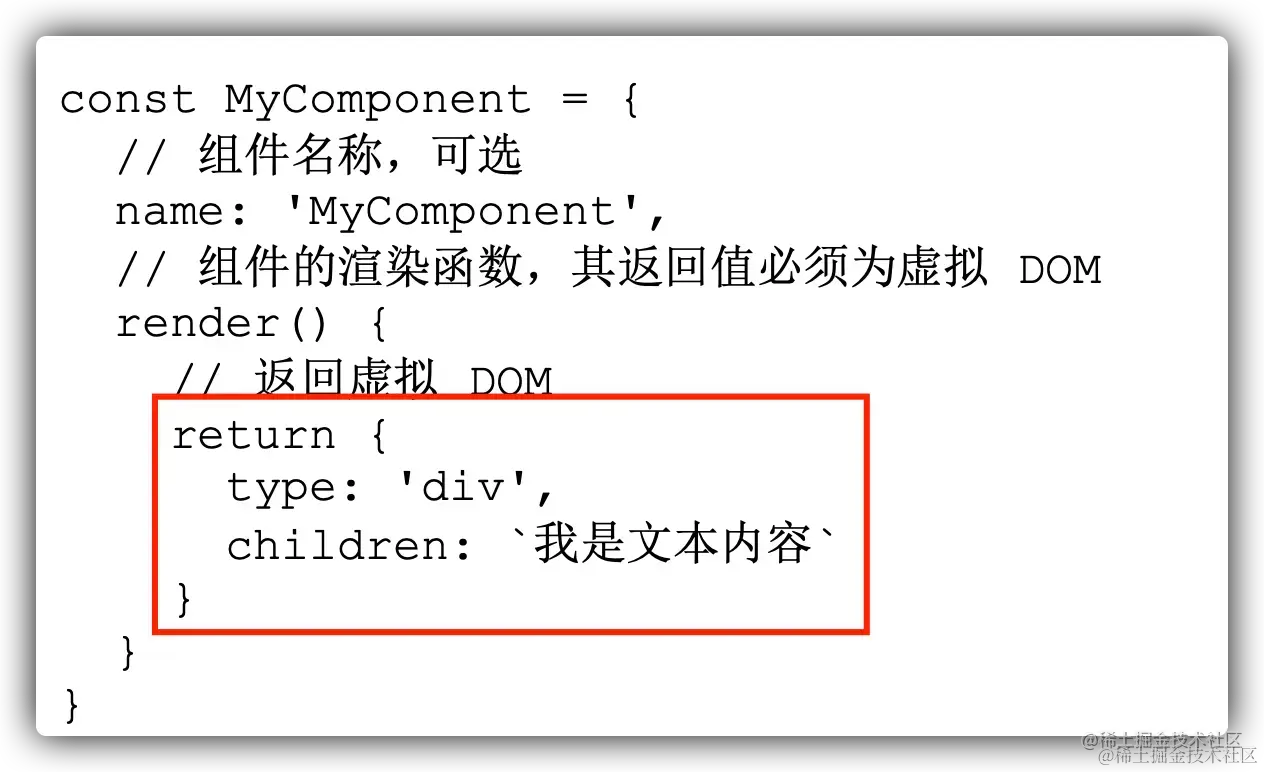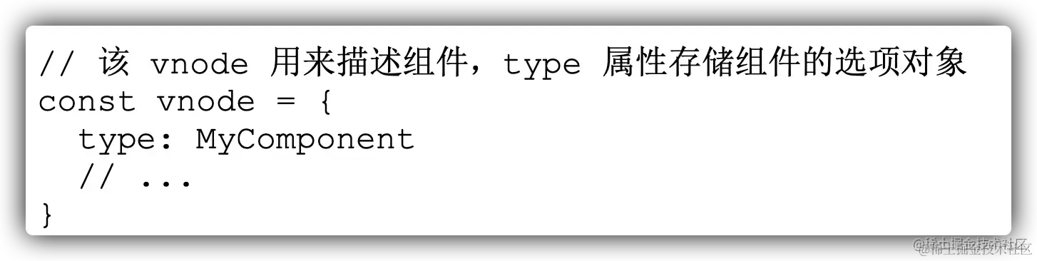 而对于组件而言,同样需要使用 vnode 来进行表示,当 vnode 的 type 属性是一个 自定义对象 时,那么这个 vnode 就表示组件的 vnode