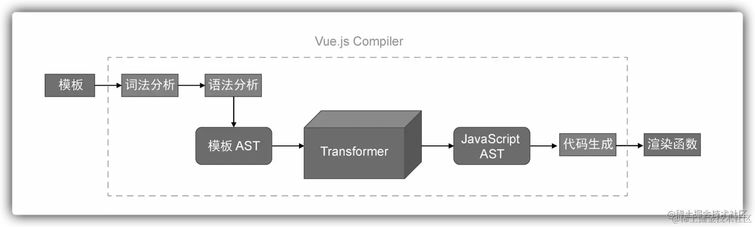 而对于 vue 的编译器而言,因为它是一个特定领域下的编译器,所以流程会进行一些优化,一共分为三大步