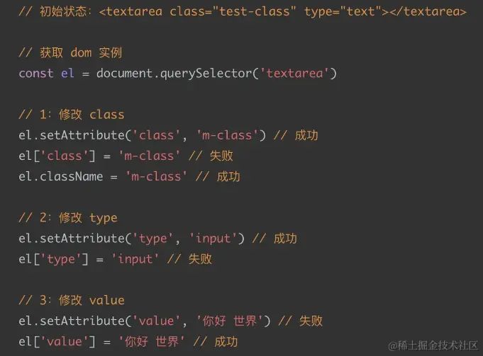 - 首先是 class: class 在属性操作中是一个非常特殊的存在。它有两个名字 class 和 className。如果我们直接通过 el.setAttribute 的话,那么必须要用 class 才可以成功,而如果是通过 . 属性 的形式,那么必须要使用 className 才可以成功。