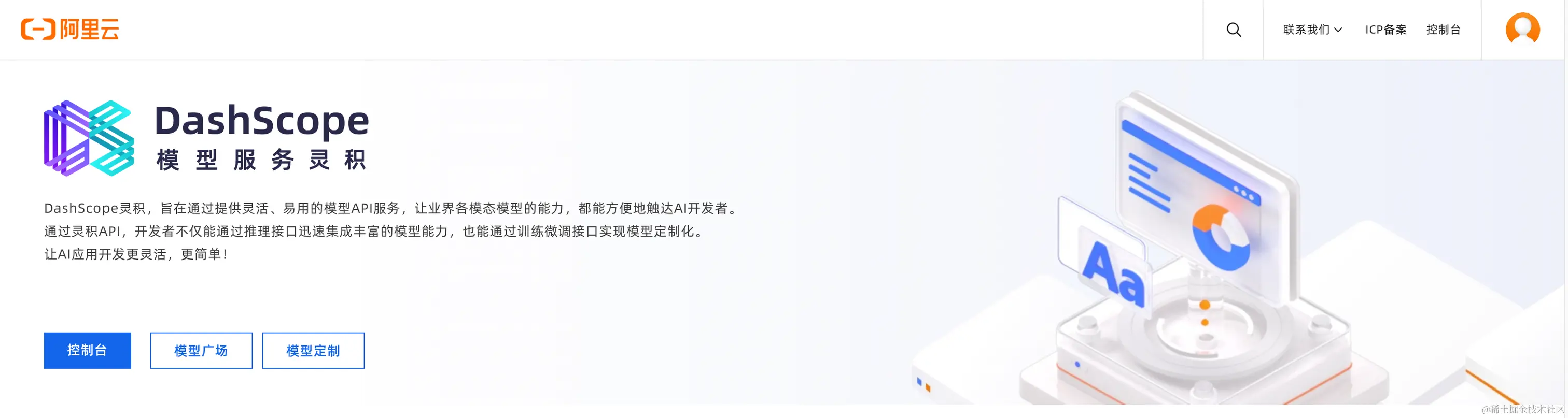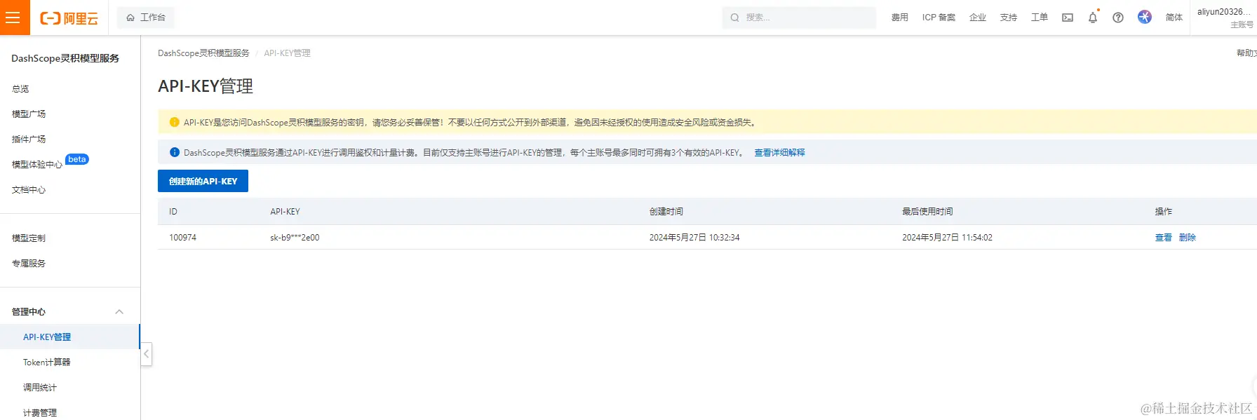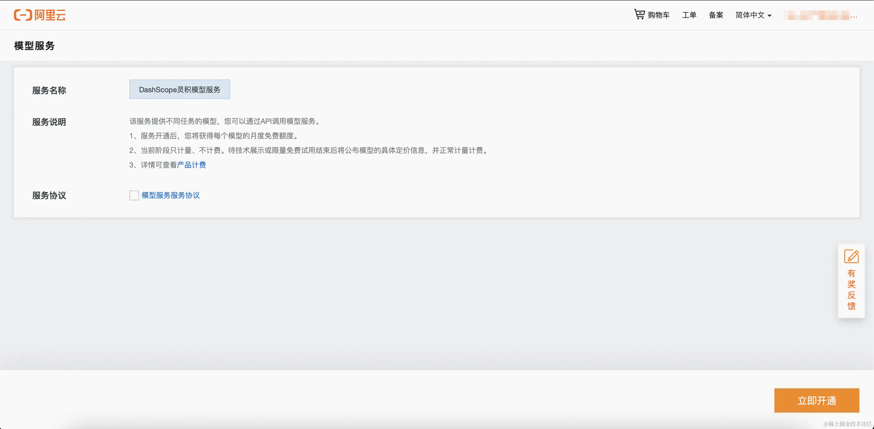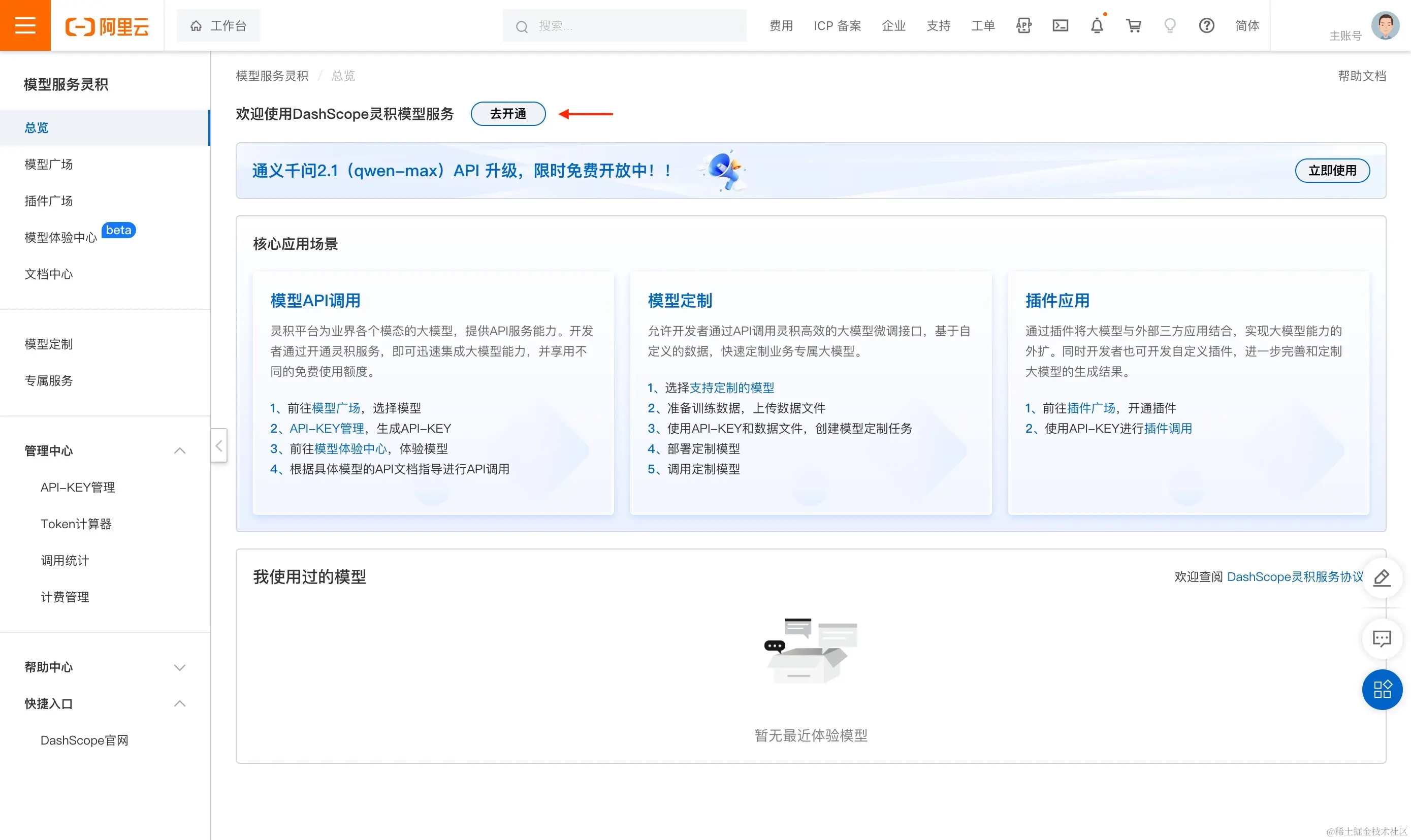 开通流程:搜索灵积模型服务,开通服务,生成阿里云灵积模型服务的apikey。