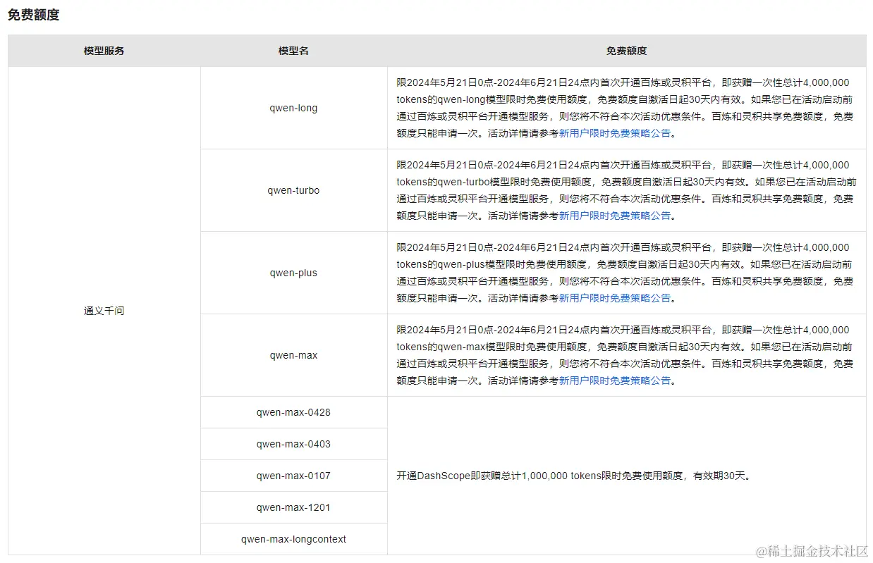 上周很多公司的大模型调用费用纷纷下调,而且一些活动给予的免费额度也是非常不错,以阿里为例:
