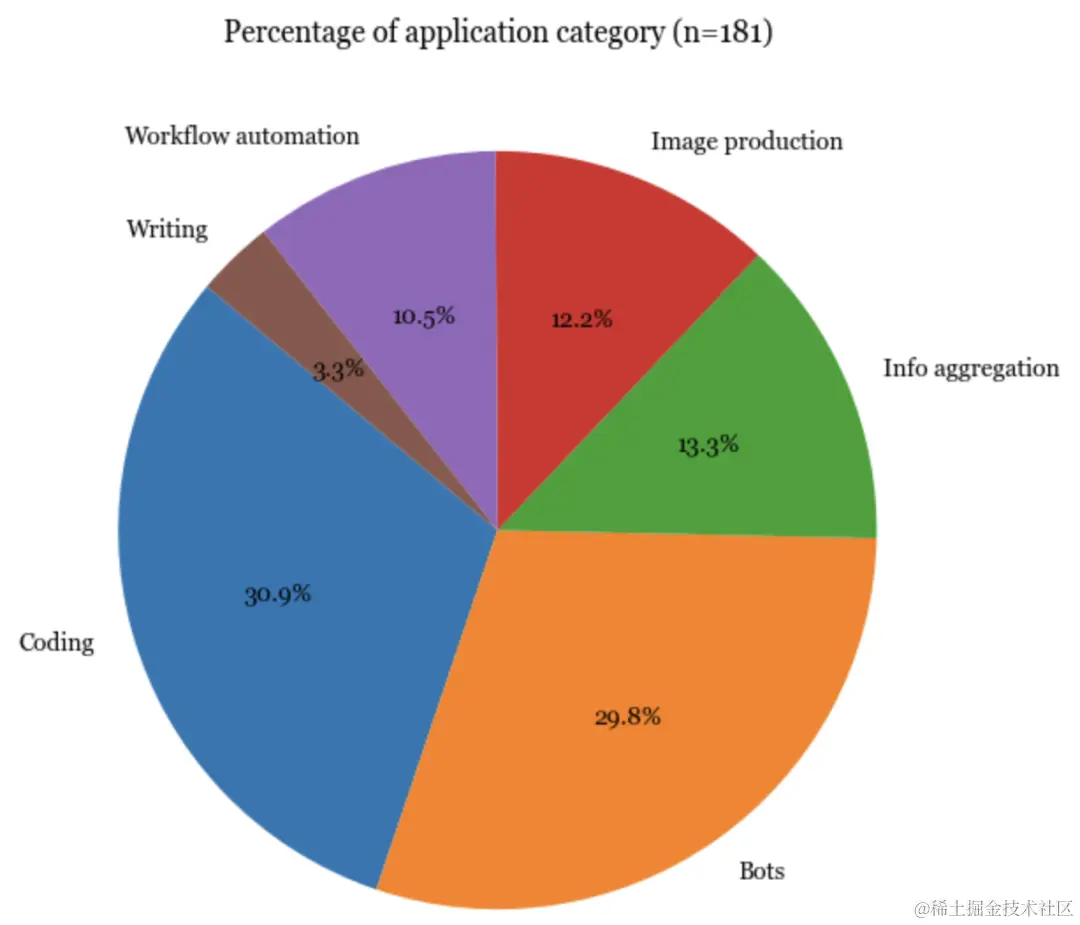 毫不奇怪,最受欢迎的应用类型是编码、机器人(例如角色扮演、WhatsApp机器人、Slack机器人)以及信息聚合(例如“将其连接到我们的Slack,并要求它每天总结消息”)。