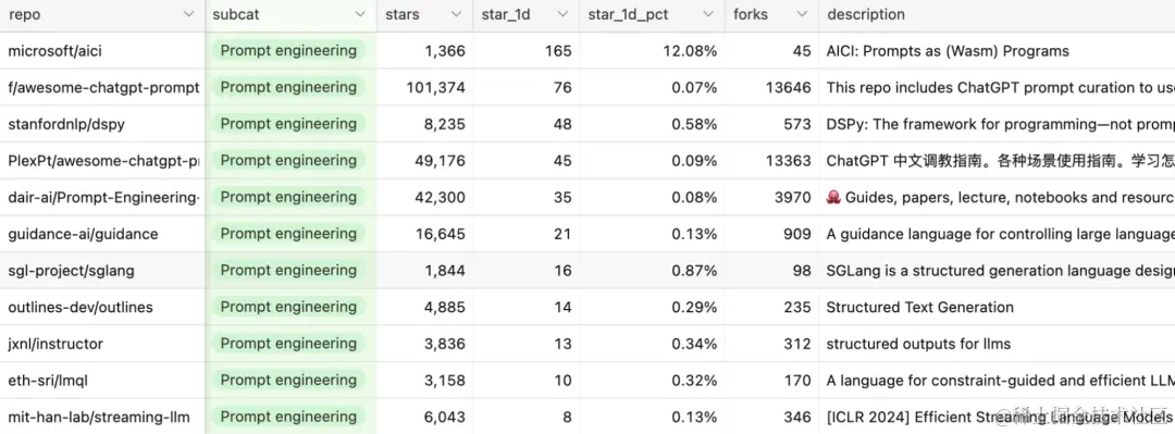 经过长时间的搜索,我找到了896个仓库。其中,有51个是教程(例如dair-ai/Prompt-Engineering-Guide)和聚合列表(例如f/awesome-chatgpt-prompts)。尽管这些教程和列表都很有帮助,但我更感兴趣的是软件,不过我还是将其放进了最终列表,只是最后的分析是基于其余845个软件库(截止本文发布)。