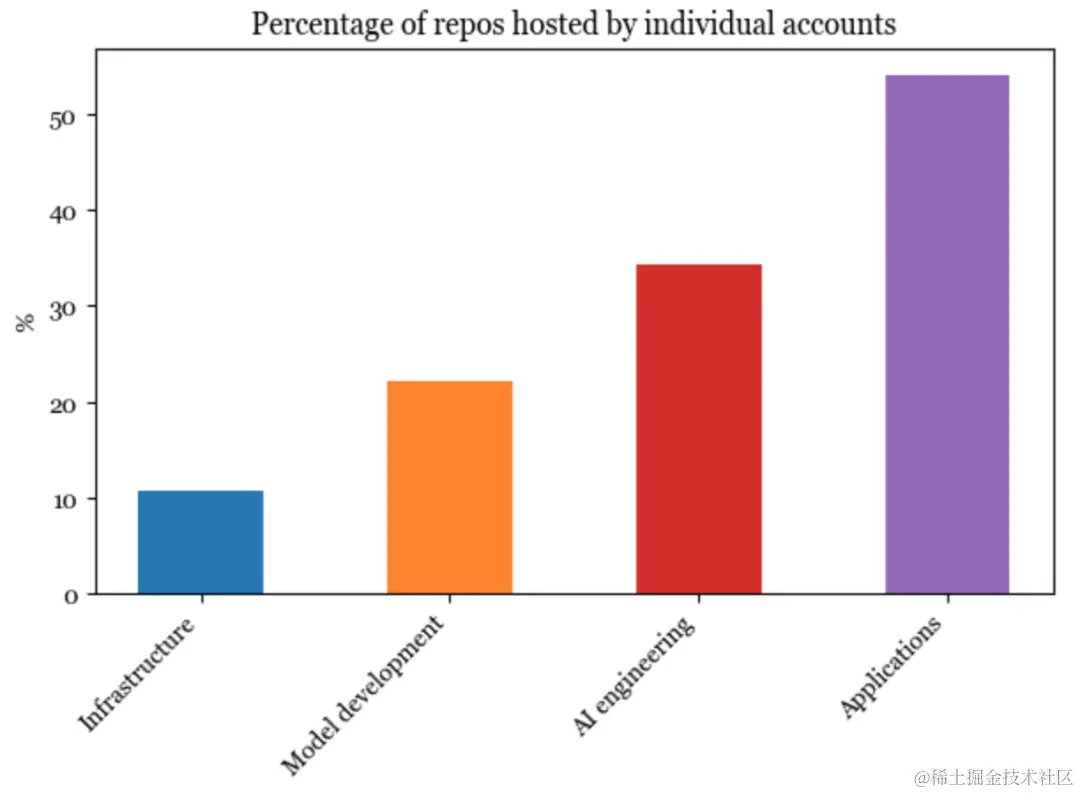 自然地,在技术栈所处的层级越低,个人开发的难度就越大。因此基础设施层的软件最不可能由个人账户发起和托管。然而,超过一半的应用程序由个人托管。