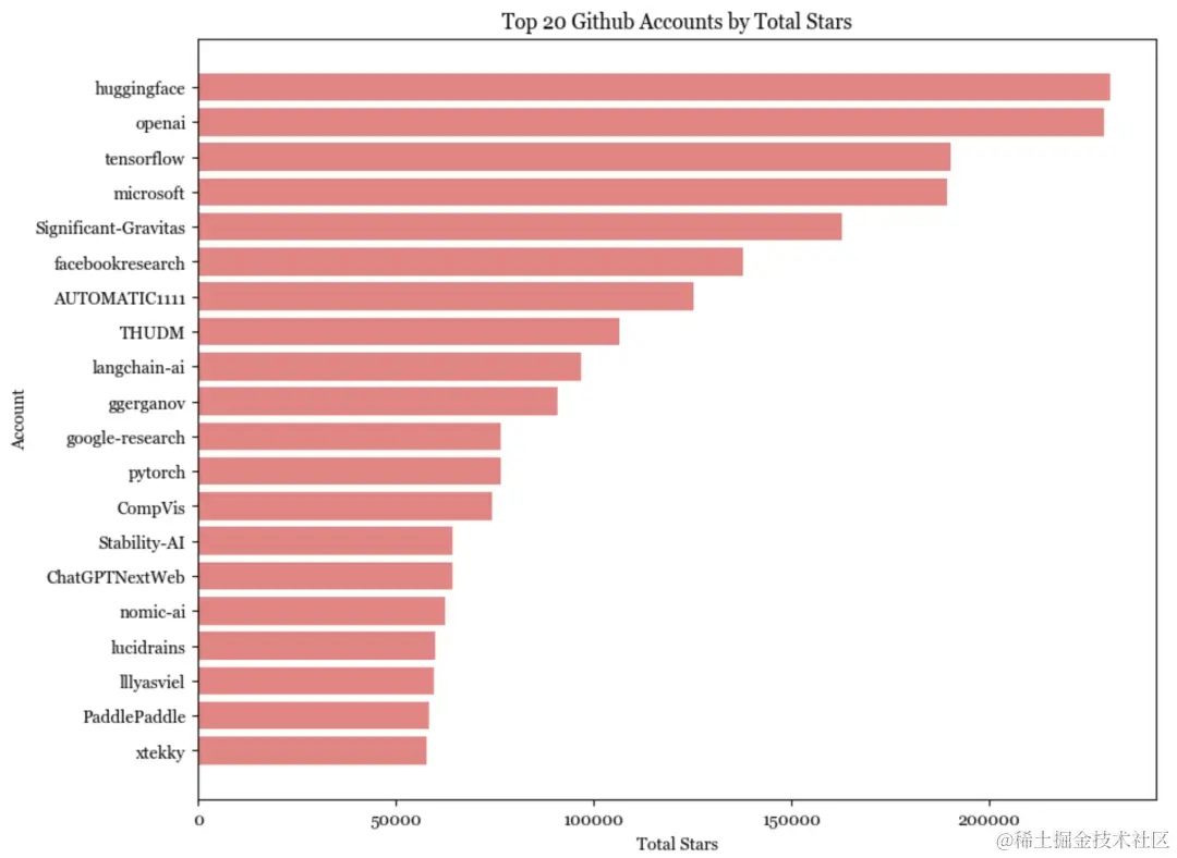 在排名top 20的账户中,唯一的个人账户是lucidrains。在拥有最多star数的top 20账户中(仅计算通用人工智能代码库),只有4个是个人账户: