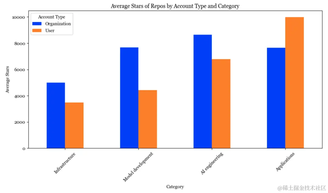 由个人发起的应用程序平均获得的star数比由组织发起的更多。许多人推测将会出现众多市值不菲的个人公司(参考OpenAI CEO Sam Altman的采访 fortune.com/2024/02/04/…