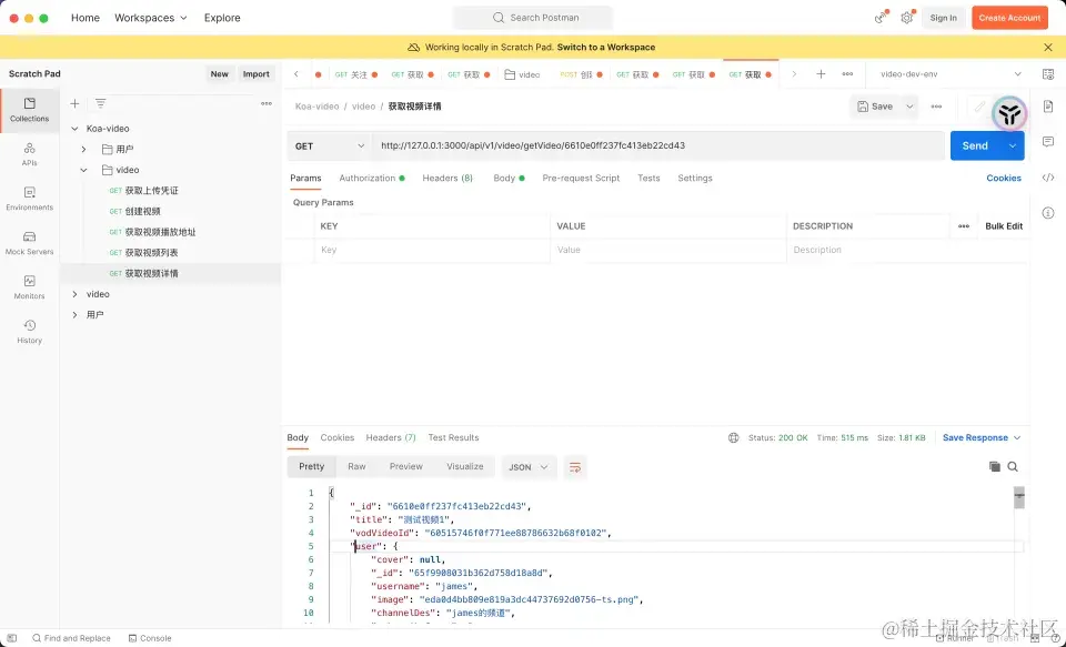 在本篇博客中,我们将探讨如何使用Koa框架实现获取视频详情的接口。这是一个常见的需求,无论是在视频分享网站还是在线教育平台,都需要这样的功能。