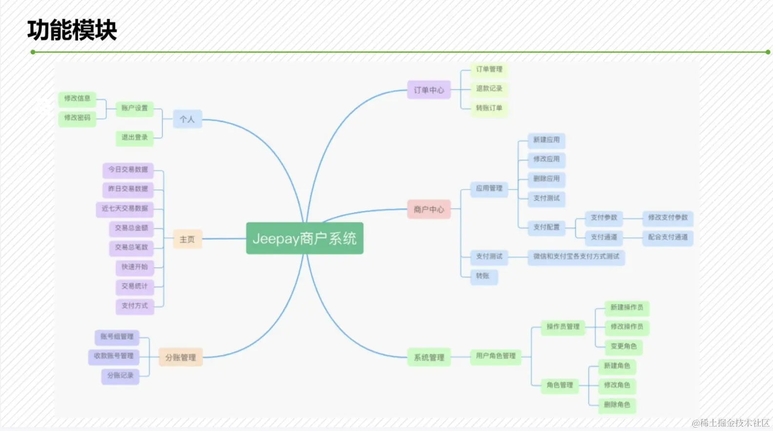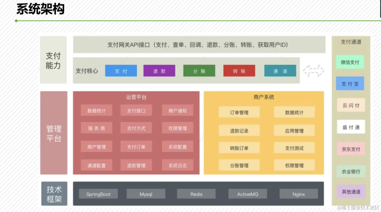 支持多渠道对接,支付网关自动路由已对接微信服务商和普通商户接口,支持V2和V3已对接支付宝服务商和普通商户接口,支持RSA和RSA2签名已对接云闪付服务商接口,可选择多家支付机构提供http形式接口,提供各语言的sdk实现接口请求和响应数据采用签名机制保证交易安全可靠系统安全,支持分布式部署,高并发管理端包括运营平台和商户系统管理平台操作界面简洁、易用支付平台到商户系统的订单通知使用MQ实现,保证了高可用,消息可达支付渠道的接口参数配置界面自动化生成使用spring security实现权限管理前后端分离架构,方便二次开发。