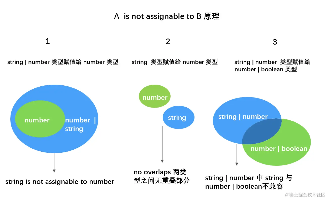 是因为两个类型范围之间有出入,正确的情况是值的类型是被赋值的那个类型的本身或者被赋值的类型的子类型。所以错误的情况,有的是一个更大更宽泛的类型赋值给了一个小的类型,就类似于两个圆,一个范围更大的圆包着小的圆,这种情况一般是对自己写的那部分进行类型收窄,或者断言成那个更小的类型。有的是两个类型之间无任何重叠部分的类型,类似于两个不相交的圆,这时候要对写的这部分类型需要重新改动,或者双重断言了。