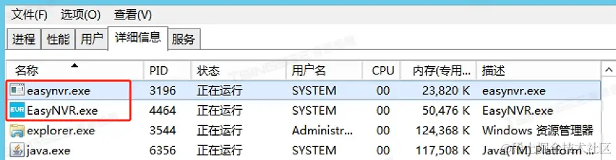 提示:成功安装EasyNVR程序后,后台应包含easynvr.exe和EasyCVR.exe两个进程(Windows环境),如果缺少一个,可优先排查是否存在端口被占用或禁用的情况。