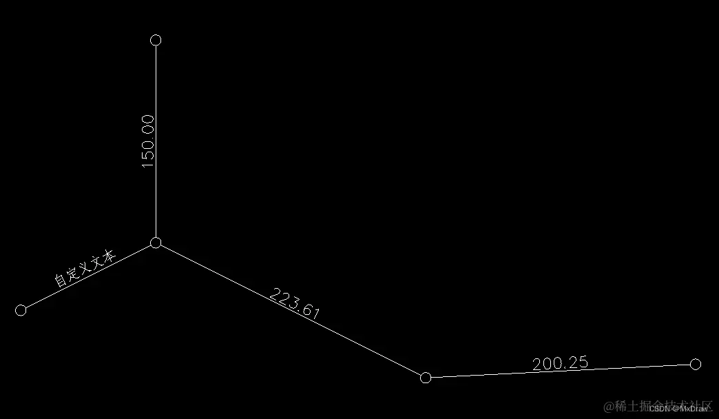 首先我们自定义一条自带文本且两个端点以圆结束的直线,其中线段自带的文本可自定义设置,默显示认为线段长度,其实现方法如下: