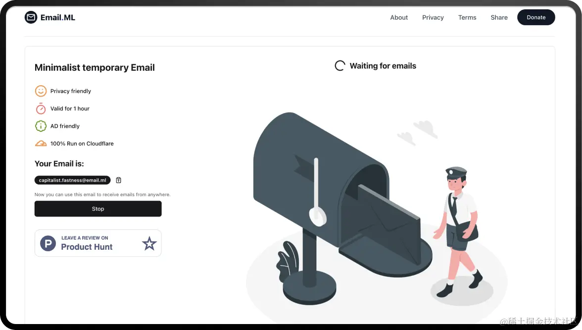 这是一个提供临时邮箱的网站,可以在1小时内使用,保护隐私,适合临时注册不重要的网站接收邮件。