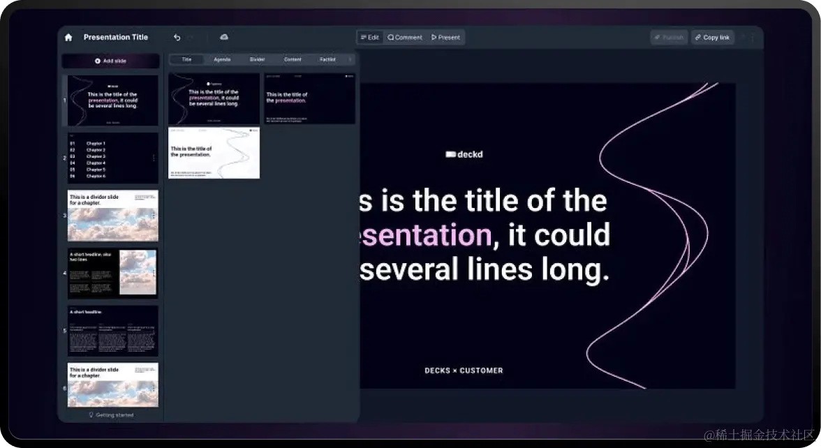 Deckd是一款基于Figma的幻灯片演示工具。它可以将Figma幻灯片的设计同步为模板,并让团队成员使用这些模板来无缝创建、编辑、展示和共享幻灯片。想法是很不错的,目前还在内测。