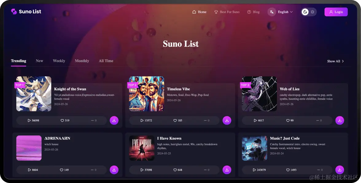 这个网站实时更新目前热门的AI音乐榜单,目前支持suno榜单的查看、下载和每日top10点评。