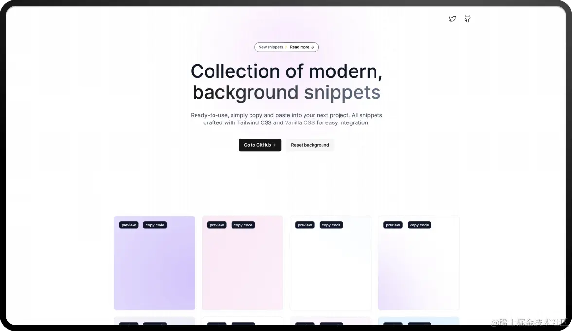 这个内容是一个代码片段的集合,很多好看简洁的背景样式。可以直接复制粘贴到项目中使用。所有的代码片段都是使用Tailwind CSS编写的。