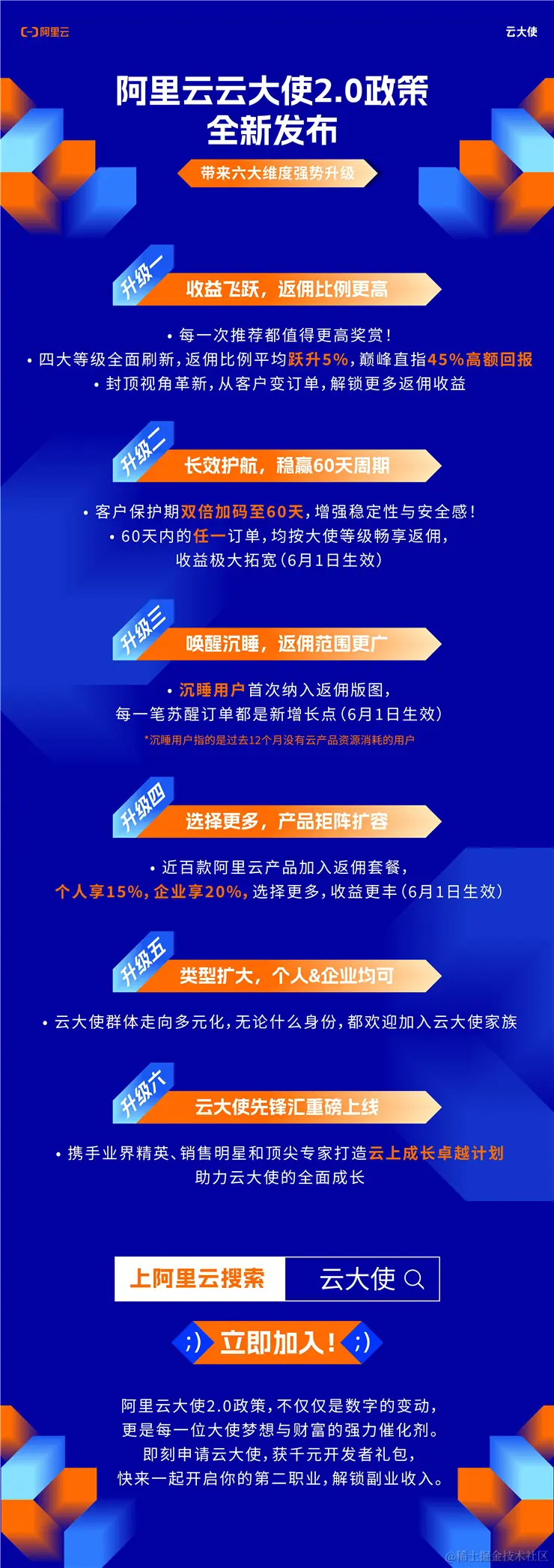 在主题为“云程发轫,焕新升级”的阿里云云大使2.0发布会上,云大使政策宣布重磅升级,包括返佣比例、客户保护周期、返佣范围、返佣产品以及参与群体等六大维度的全面提升。其中,返佣比例从最高35%提升至最高45%;云大使也不再局限于个人,包括企业在内的全社会各种角色均可申请成为云大使。