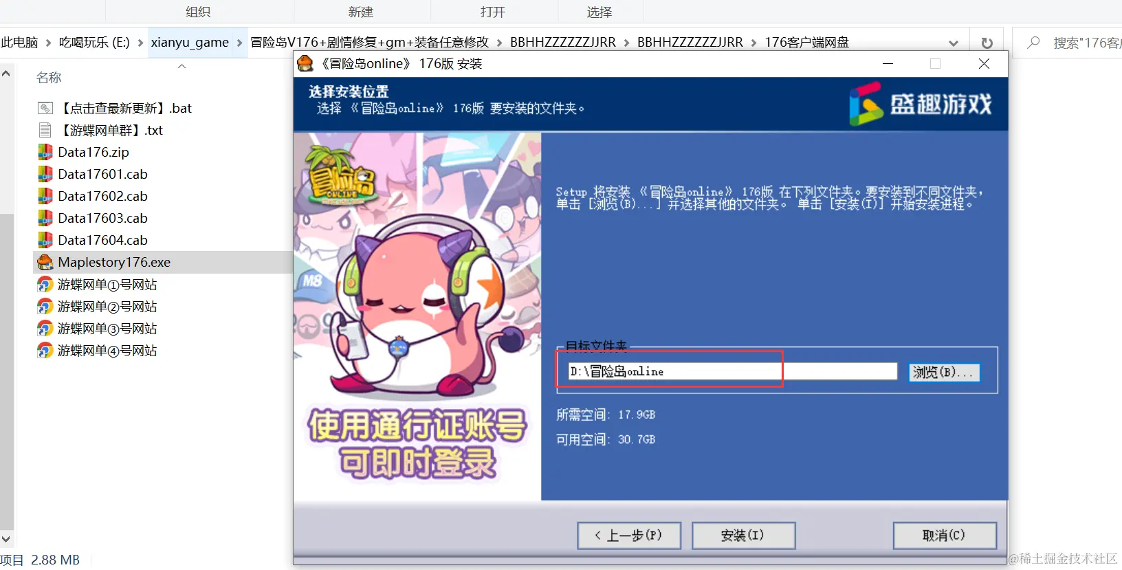 解压安装客户端,找到 Maplestory176.exe , 安装到 D:\冒险岛online