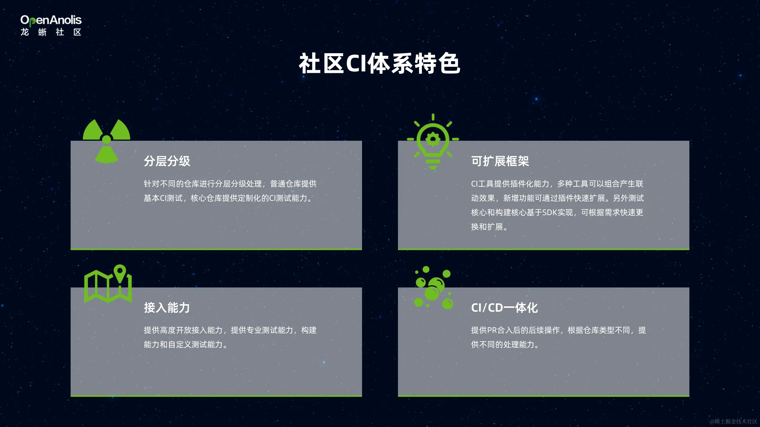 社区 CI 体系特色分为四大部分:第一是分层分级,针对不同仓库可以进行分层分级处理,普通仓库提供基本 CI 测试,核心仓库提供定制化的 CI 测试能力。第二是可拓展框架,CI 工具提供了插件化能力,多种工具可以组合产生联动效果,其中新增功能可以通过插件进行快速扩展。第三是接入能力,提供高度开放的接入能力,可以让开发者自定义开发测试来接入 CI 服务体系。第四是 CI/CD服务一体化,提供 PR 合入后的后续操作,根据仓库类型不同提供不同的处理能力。